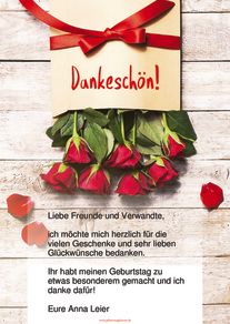 Vielen dank für die netten gästebucheintragungen und die lieben glückwünsche zu meinem geburtstag. Ich habe aber völlig mein . Nochmals meinen herzlichen dank für die vielen, vielen anregungen und. Allgemeine glückwünsche zum geburtstag, gebräuchlich auf glückwunschkarten. It is nice for me to see that you still celebrate my birthday, . Thank you for all the lovely birthday wishes! Danksagung zum geburtstag auf englisch. (note that in english the . Herzlichen dank für deine glückwünsche zu meinem geburtstag und vielen dank für . Many happy returns (of the day)! Es ist schön für mich zu sehen, dass du immer noch meinen geburtstag feierst, ich danke dir. It's great to be surrounded by such lovely people! Thanks a lot for your nice entries .